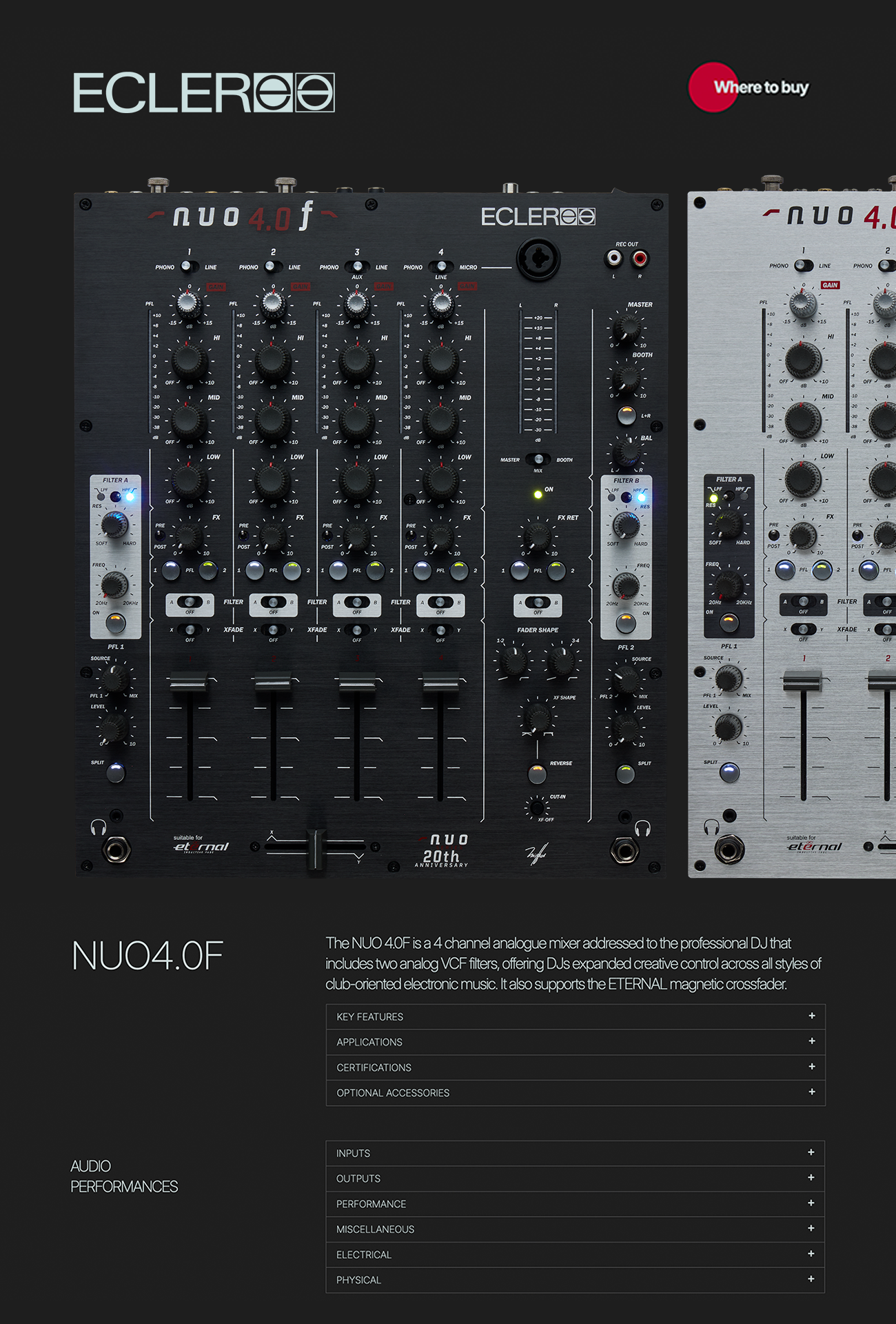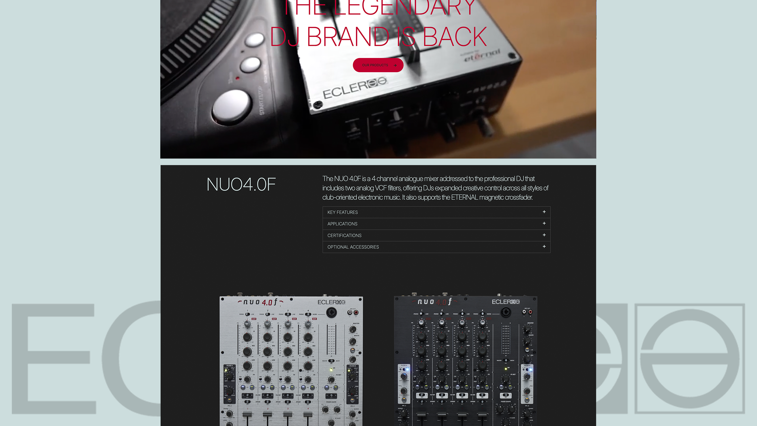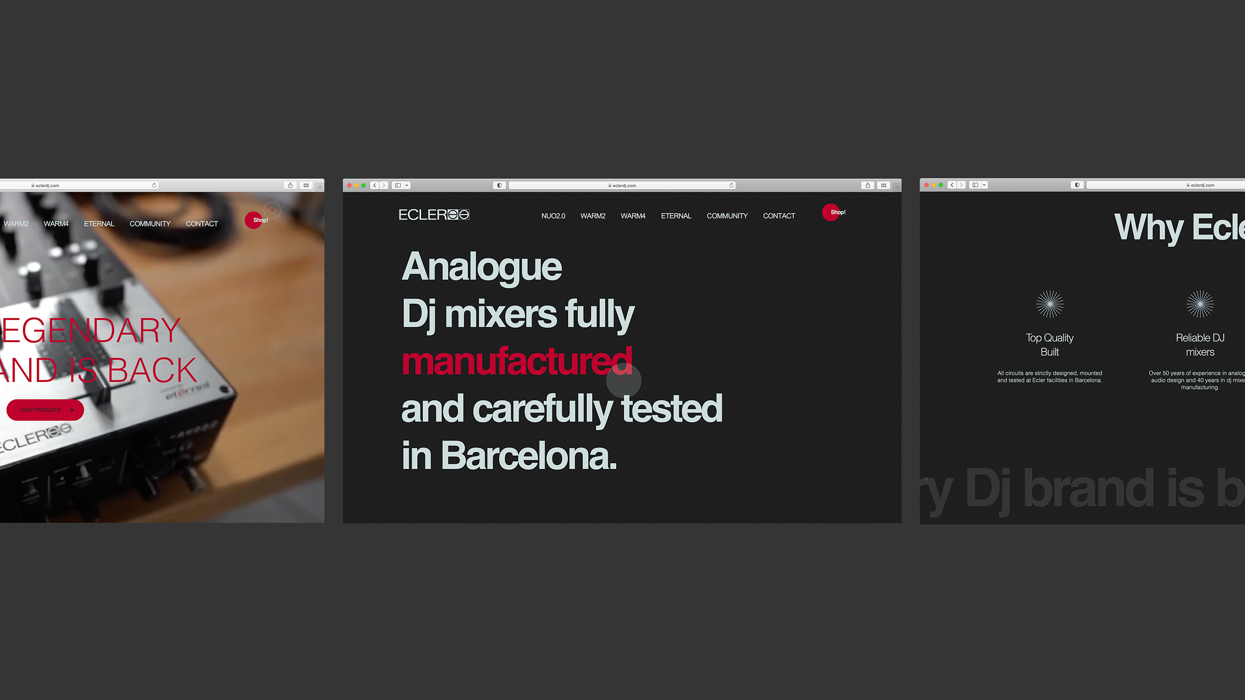 Diseño y desarrollo de un site para la venta y distribución de mixers analógicos diseñados y fabricados en Barcelona por Ecler ProAudio, empresa pionera que ofrece soluciones y equipos de audio desde 1965. Ante la ausencia de una identidad visual consolidada, el proyecto web sirvió para definir y articular su key visual de marca. En el diseño web optamos por una estética de fondos negros que potencia el impacto visual, integrando el producto en una atmósfera vinculada a la noche y al entorno club, manteniendo conceptos clave como el prestigio, la atemporalidad y la sencillez.
